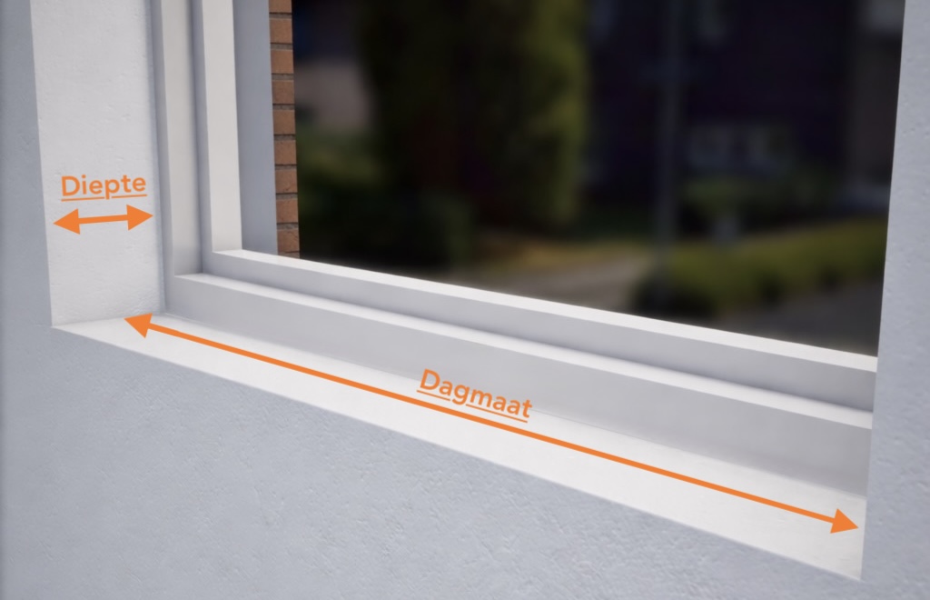 3. Meet vervolgens de diepte van de raamdorpel: vanaf de achterzijde muur tot de voorzijde van de muur (bijvoorbeeld de gemetselde steen). Voeg ongeveer 3 tot 4 cm toe voor de gewenste overstek aan de voorzijde.